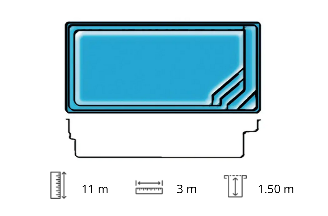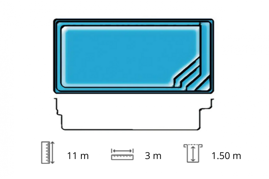 Le couloir de nage Cuba est une coque de piscine polyester de forme rectangulaire avec escalier d'angle et banquette. Couloir de nage Cuba à fond plat 1.50 m.