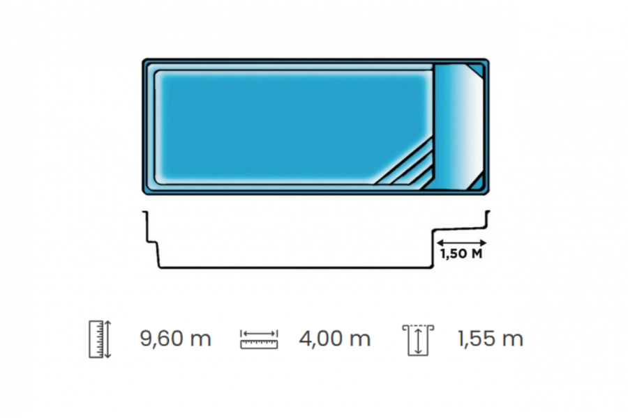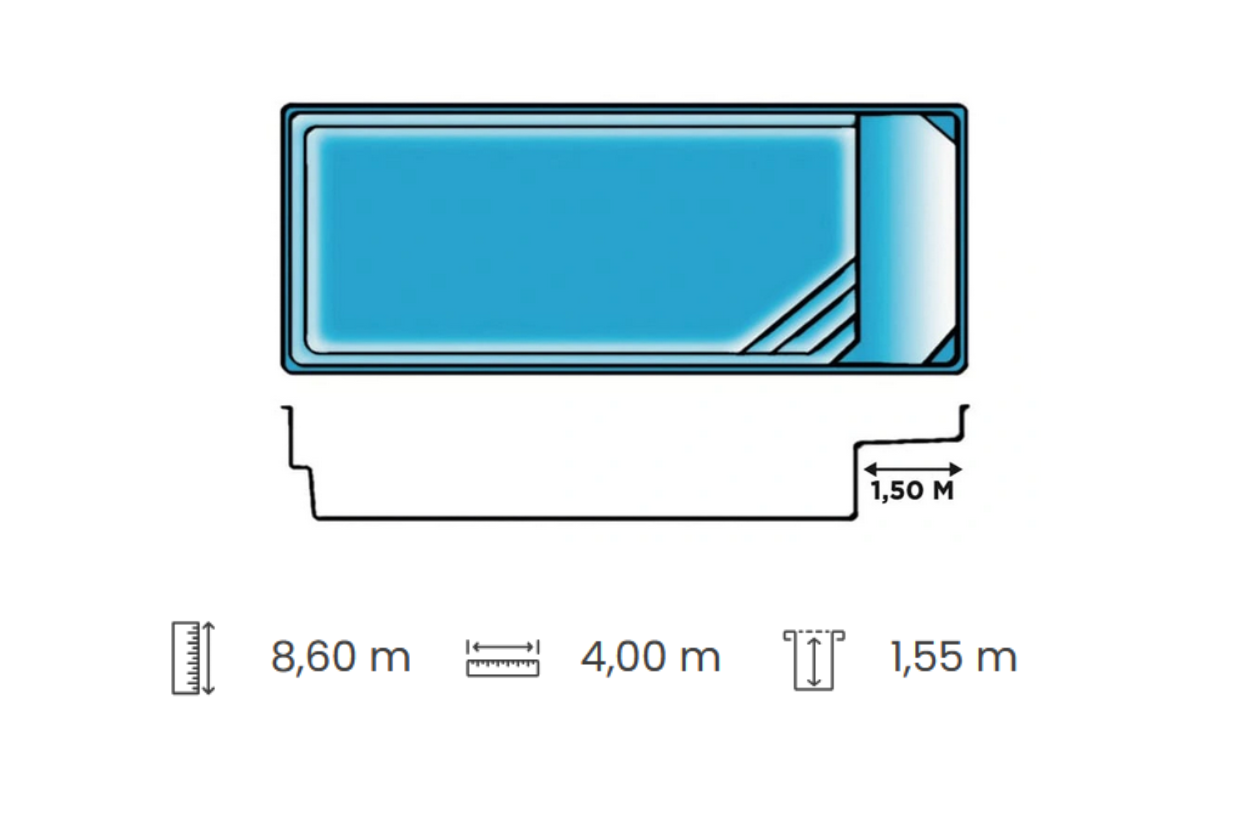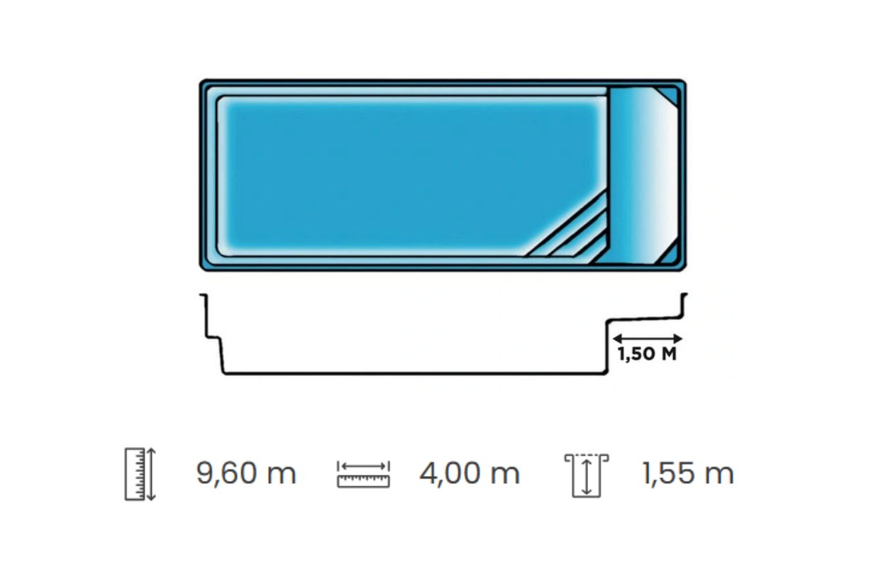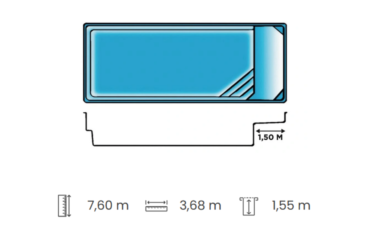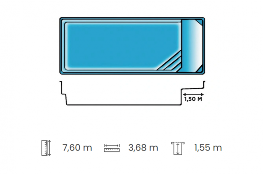 Piscine avec plage Cap-Vert, une piscine coque polyester à fond plat, en kit. Piscine rectangulaire avec angles droits, banquette et escalier d'angle spécialement conçue pour conserver le maximum de surface de nage. Plage de 1,50 m.
