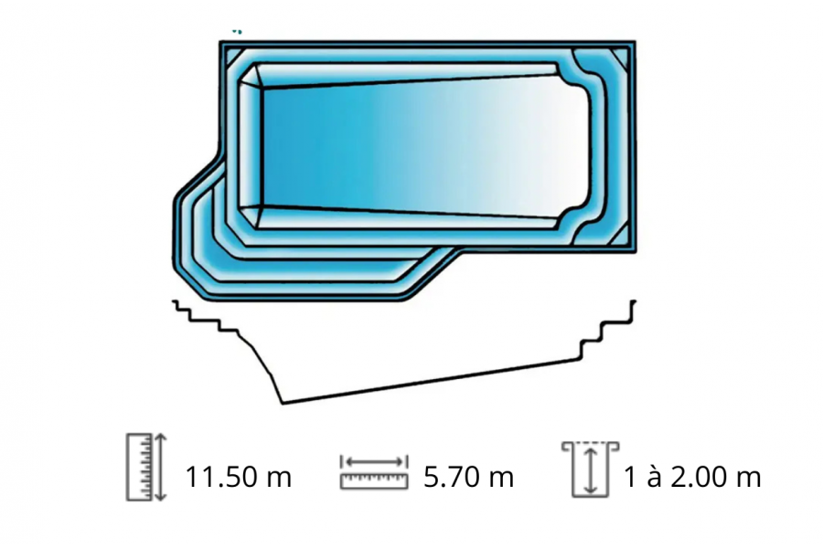 Piscine avec plage immergée coque polyester de 11,50 x 5,70m