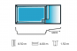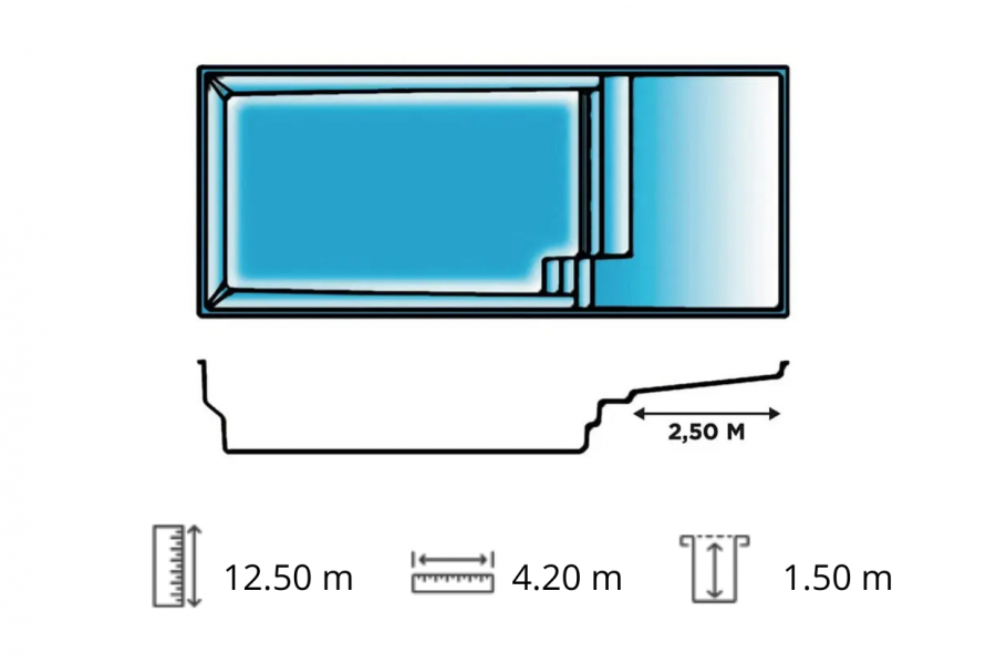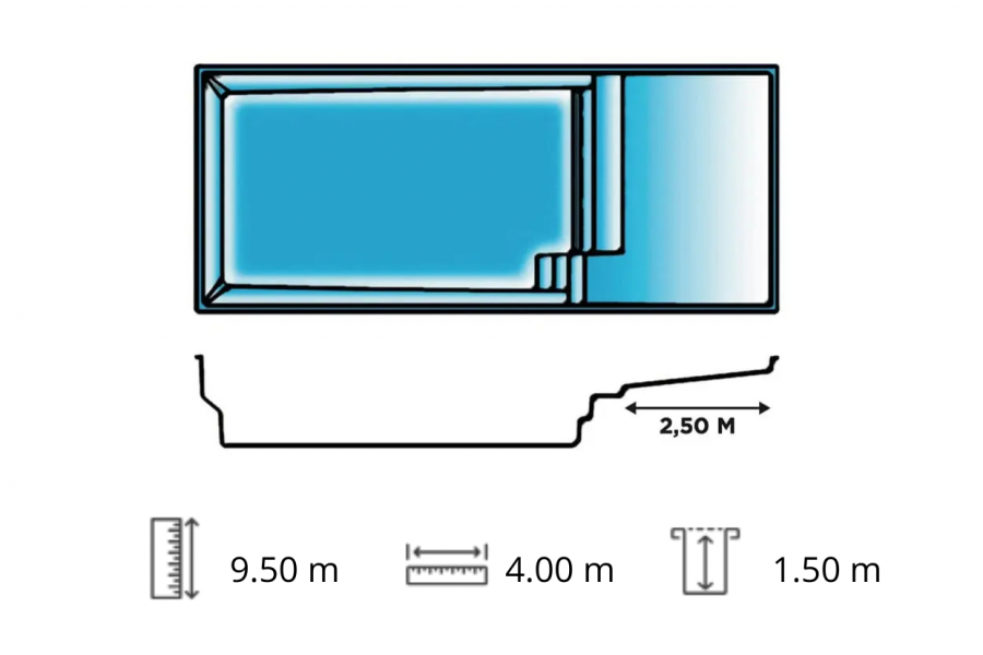 Grande piscine avec plage Paques. Piscine rectangulaire angles droits une coque polyester avec fond plat, banquette et escalier immergés et une plage spacieuse (2,50 m) en extrémité de bassin.