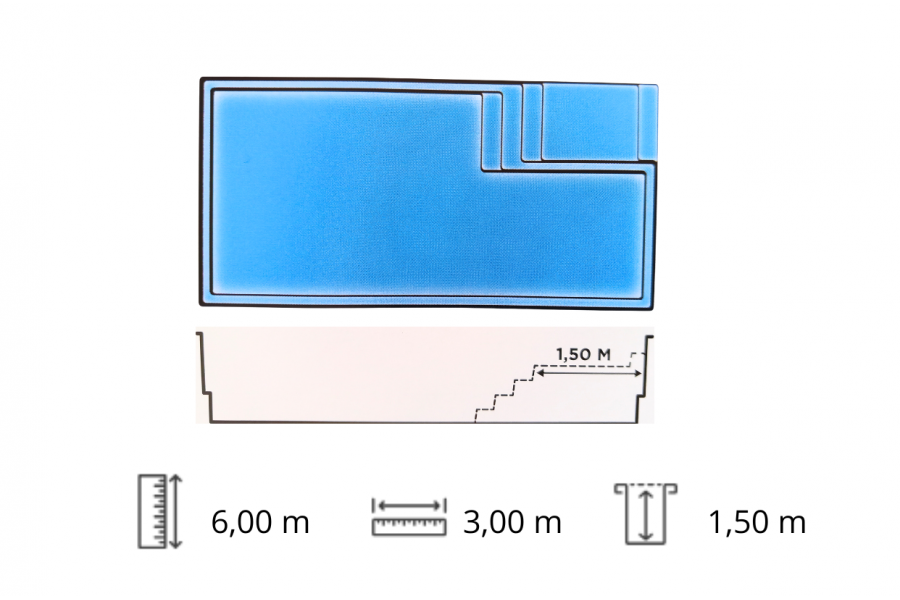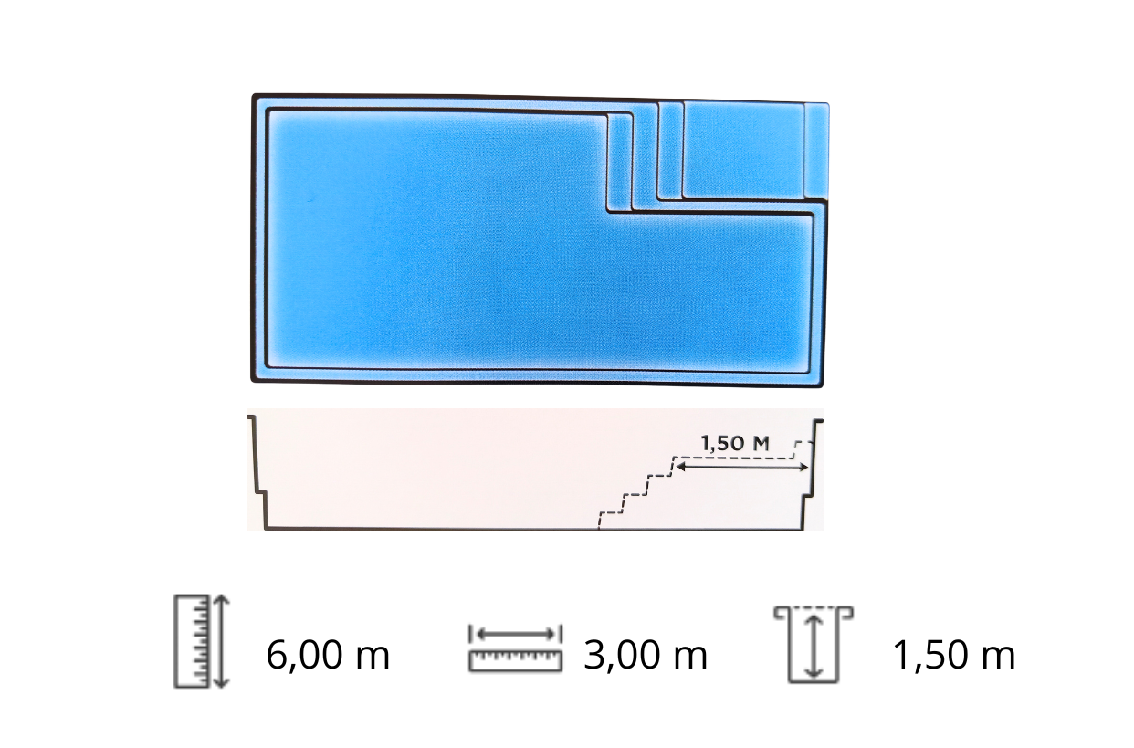 Piscine en kit rectangulaire Seychelles, une piscine coque polyester avec plage et fond plat. Forme rectangulaire, angles droits, banquette et escalier immergés et une plage en qui optimise l'espace de nage utile.
