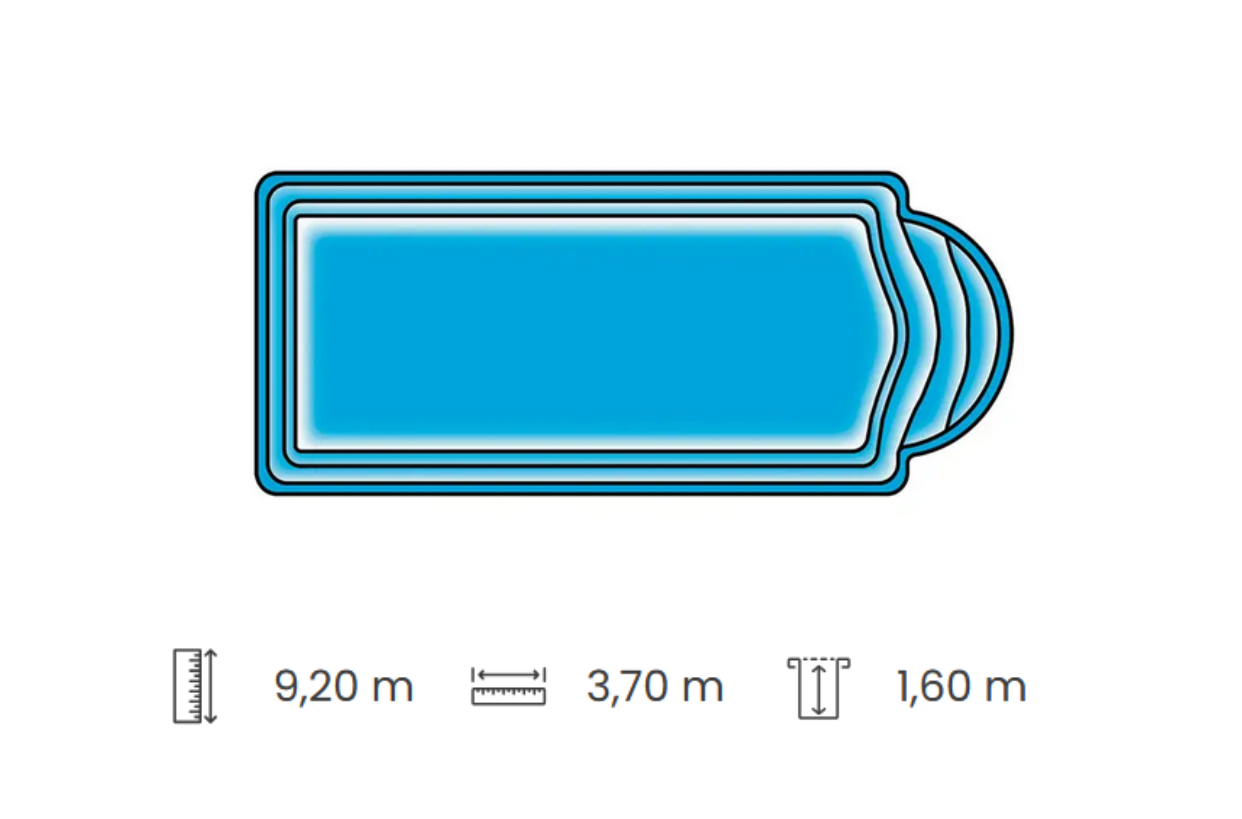 Le kit piscine Syrte 2, une piscine coque polyester à fond incliné présente une forme "romaine" et une longueur généreuse de 9,20m. Vous vous laisserez aller à la détente et au plaisir de la baignade.