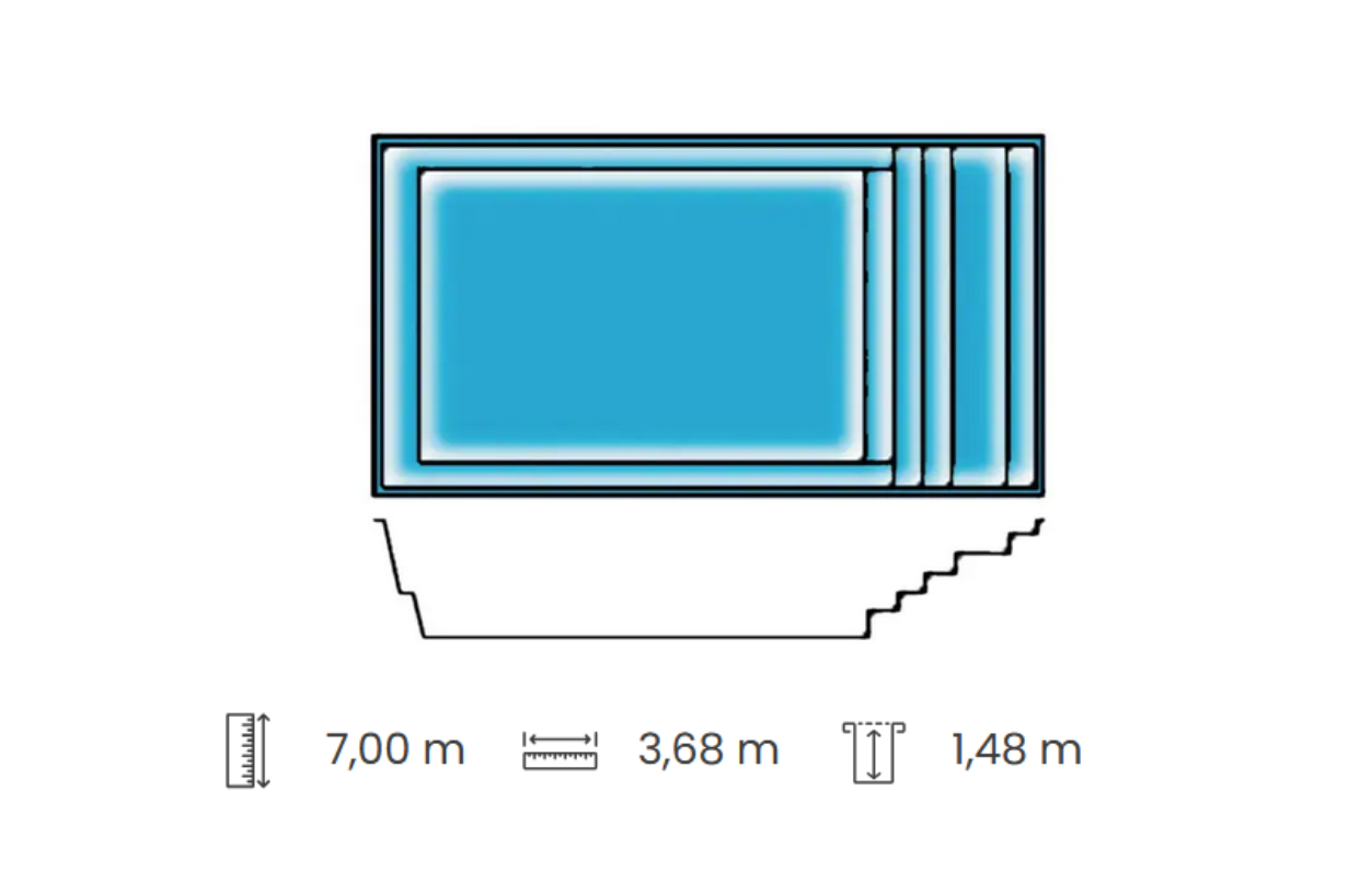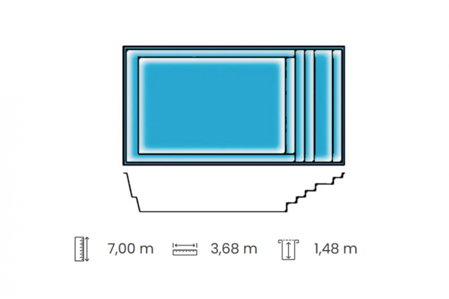 - 1 coque polyester de piscine rectangulaire 7.00 x 3.65 fabriquée en France