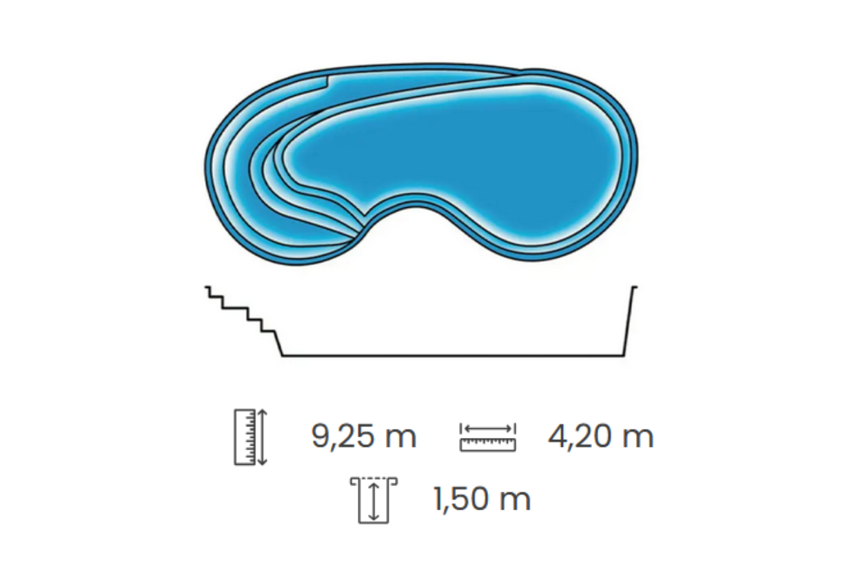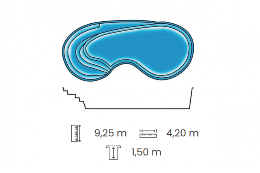 Thématique du kit piscine Indienne : piscines, piscine en kit, piscine polyester, piscine coque, grande piscine en amande, coque polyester, piscine avec plage, fond plat, piscine avec escalier, coque de piscine.