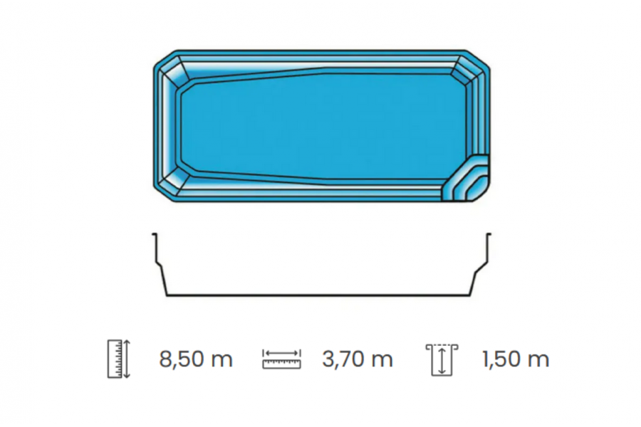 Piscine rectangulaire enterrée en kit, une piscine coque polyester à fond plat. De forme à la fois classique et contemporaine. Une piscine rectangulaire avec angles droits ou biseautés, escalier d'angle, conçu pour ne pas casser la ligne aux formes épurées.