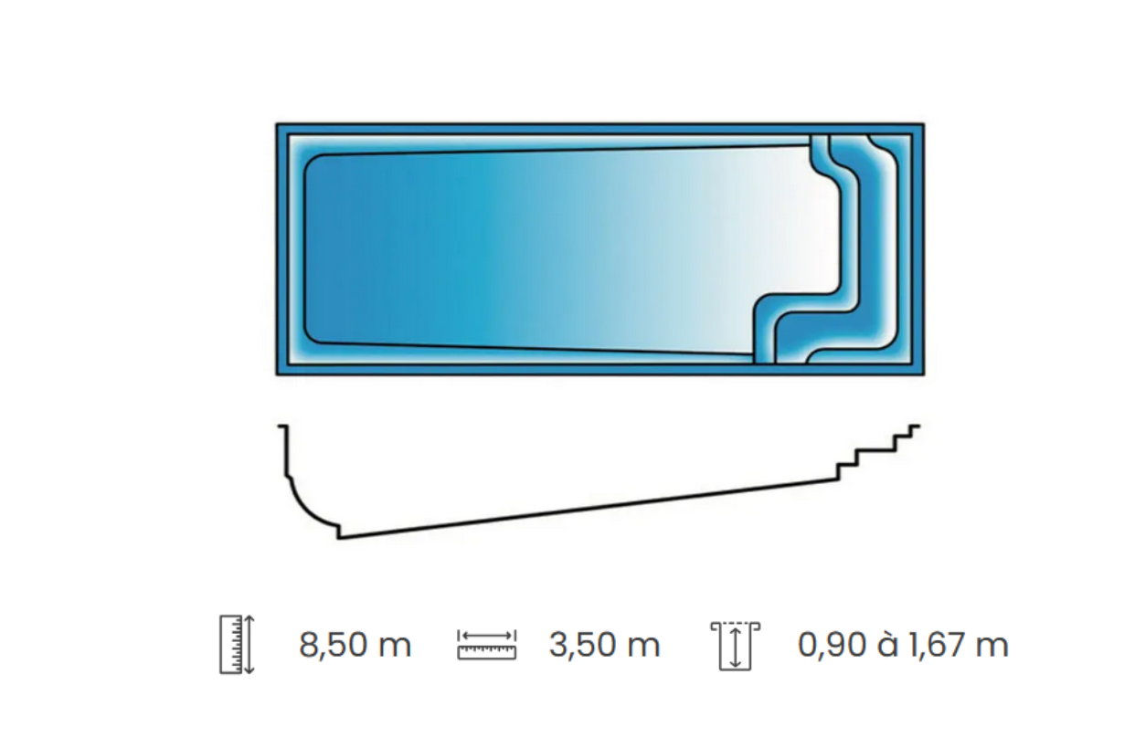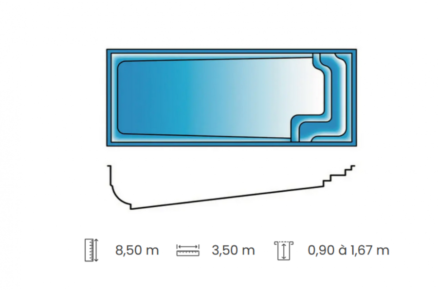 La structure de nos piscines coques polyester est renforcée à l'extérieur au moyen de renforts verticaux et horizontaux de type Omega et/ou Equerre , répartis suivant les formes et les contraintes de nos modèles.