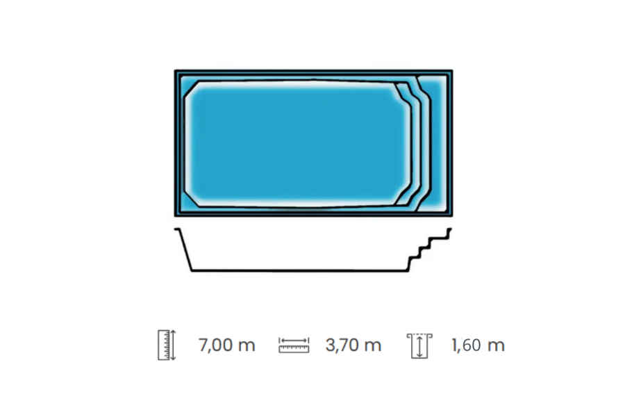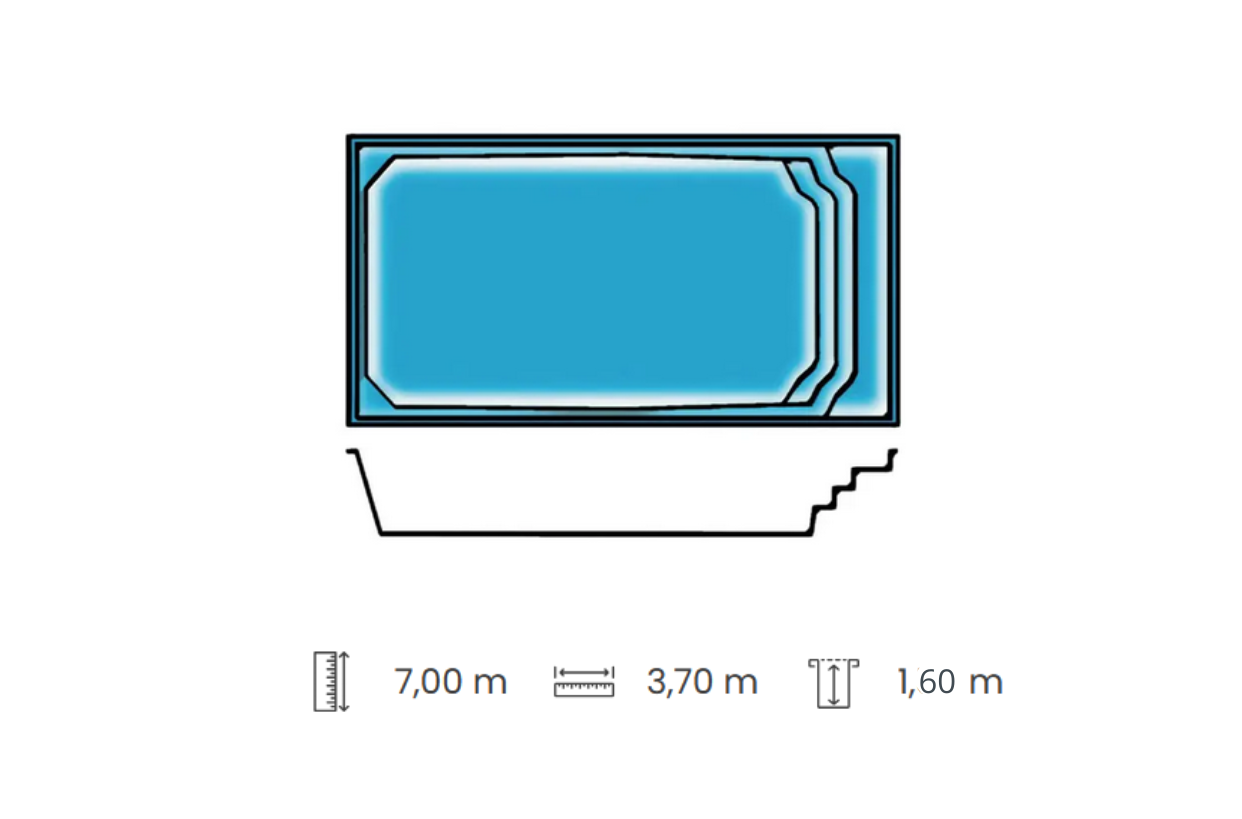 Sicile votre kit piscine polyester. Une coque de piscine rectangulaire à fond plat avec escalier banquette, une piscine pour toute la famille.
