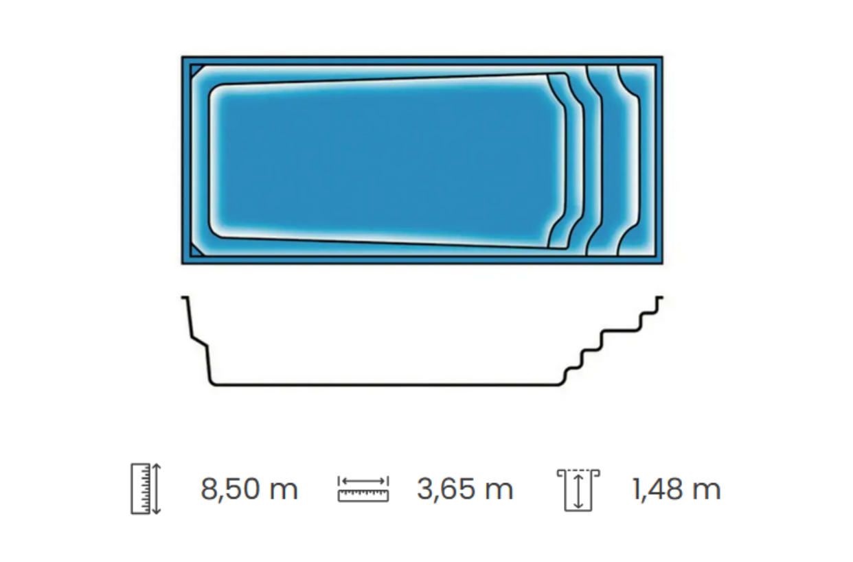 Piscine en kit Malte : une piscine coque polyester à fond plat. Piscine rectangulaire avec angles droits, modèle tendance, bassin rectangulaire avec escalier banquette, conçu pour ne pas casser la ligne aux formes épurées.