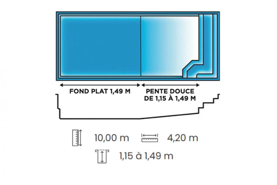 Piscine rectangulaire à deux fonds, une piscine coque polyester avec un fond en pente puis un fond plat permettant un compromis jamais atteint en terme d'architecture piscine ! Une piscine polyester en kit pouvant recevoir un volet de sécurité immergé à prix réduit sans aucune perte de surface de nage.