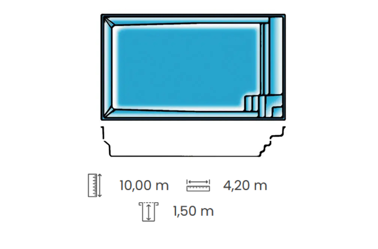 Tahiti, kit piscine rectangulaire une piscine coque polyester, bel escalier d'angle, banquette et fond plat, la nouvelle tendance . Grande longueur : 10 m, cette piscine rectangulaire participe à la mise en valeur de votre propriété .